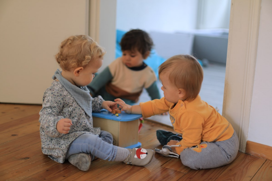 Im Spielzimmer gibt es verschiedene Angebote, auf die sich die Kinder nach eigenen Vorlieben verteilen können. Die Einrichtung ist so gestaltet, dass alle vorbereiteten Materialien selbstständig erreichbar sind. Viele Spielsachen ermöglichen den Kindern, Fertigkeiten zu erlernen, die sie nutzen können, um mehr Selbstständigkeit im Alltag zu entwickeln. Beispielsweise gibt es Übungen, bei denen es darum geht den Umgang mit dem Löffel zu üben. Spielerisch werden die Kinder so darauf vorbereitet, eigenständig zu essen.